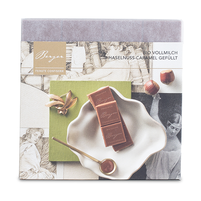 Schokolade Haselnusscaramel, Bio – Vollmilchschokolade 100g – Confiserie Berger