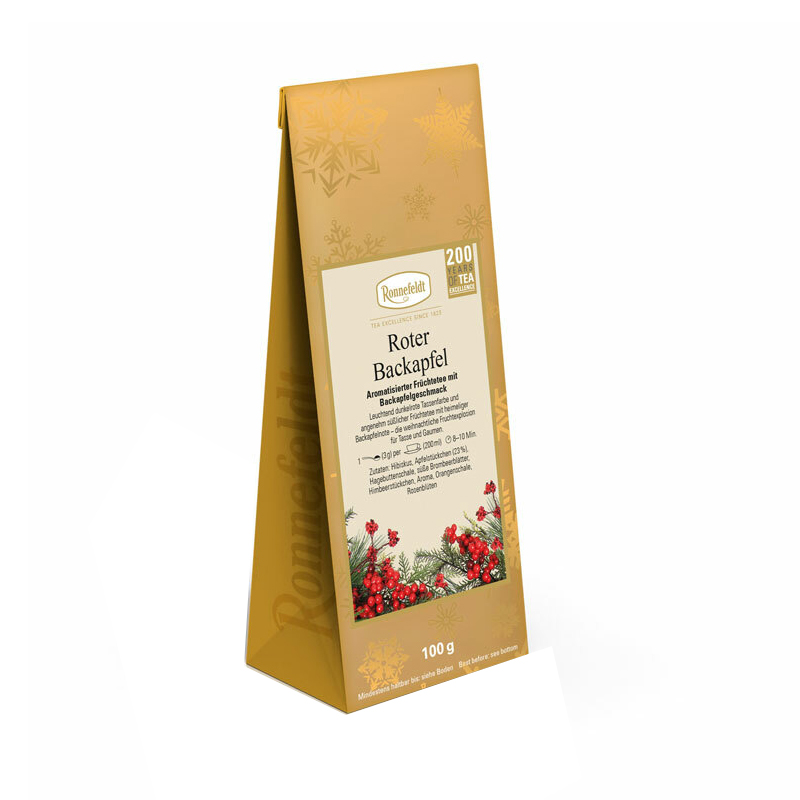 Aromatisierter Früchtetee mit Backapfelgeschmack. Leuchtend dunkelrote Tassenfarbe und angenehm süßlicher Früchtetee mit heimeliger Backapfelnote. Die weihnachtliche Fruchtexplosion für Tasse und Gaumen.